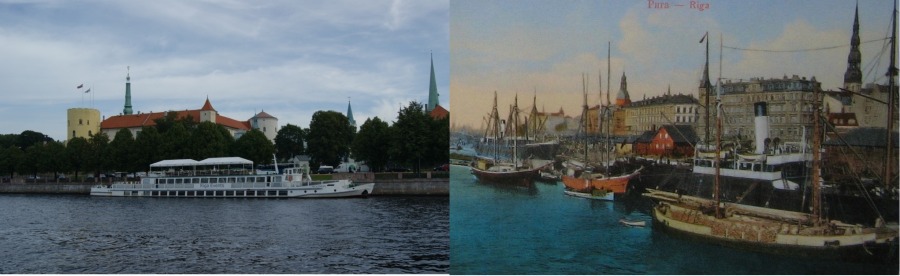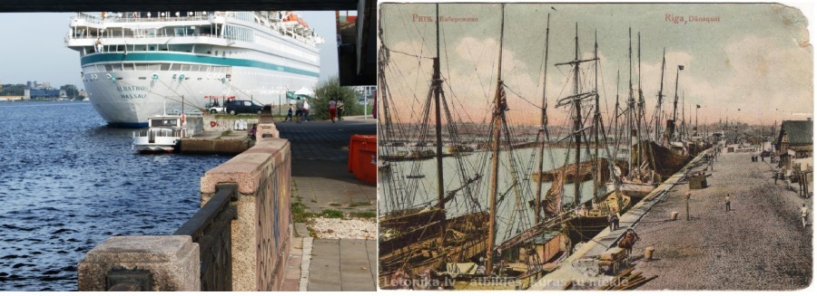 Между Вантовым и Каменным мостами открывается знаменитый вид на старый город Латвийской столицы. Как и прежде, здесь снова стоят корабли, правда теперь это круизные теплоходы, а не торговые корабли.