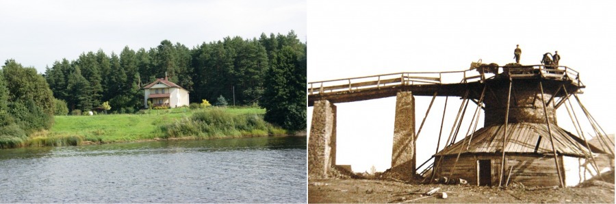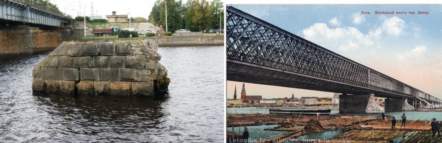 У железнодорожного моста то тут, то там торчат руины старого железнодорожного или земгальского моста.