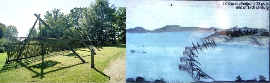 Рядом можно осмотреть специальные устройства для ловли миноги и лосося. Эти деревянные мостки устанавливали прямо в реке, ведь реки Латвии часто были достаточно мелкими.