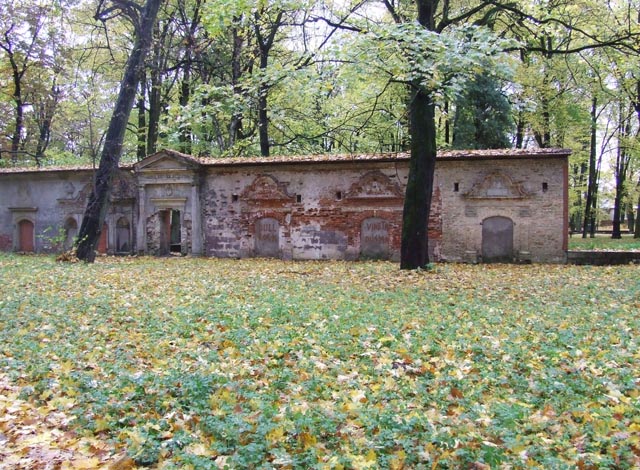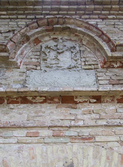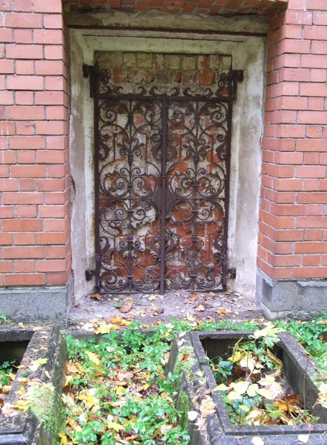 Одна из дверей в склеп. Она замурована. Сохранившаяся металлическая решетка, возможно, отсюда, возможно, из другого склепа.