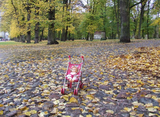 На центральной аллее, среди опавших листьев, одиноко стояла детская колясочка с куколкой.